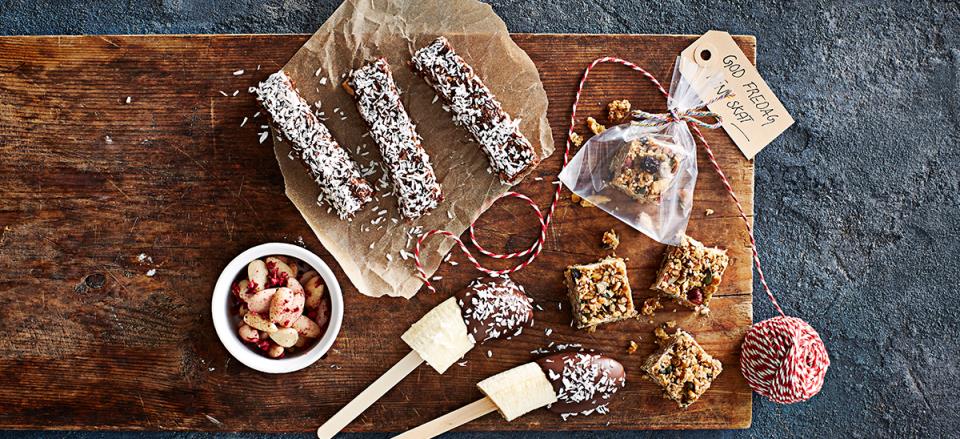 Stik en ispind i hver og dyp dem i chokolade en af gangen og drys straks med nøddeflager eller kokos.