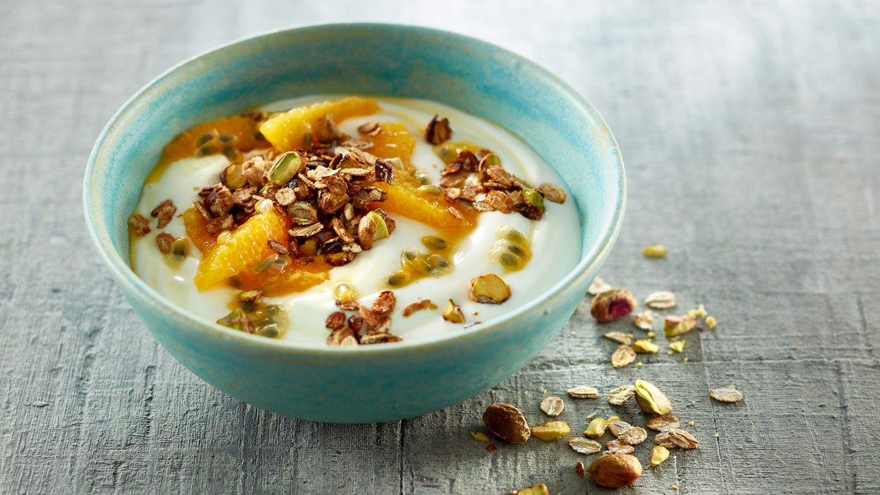 Hæld det syrnede produkt i skåle og fordel frugt og flager herpå.