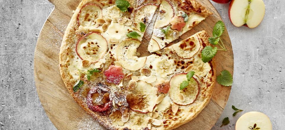 Æblepizza med mascarpone, kanel, mandler og flormelis