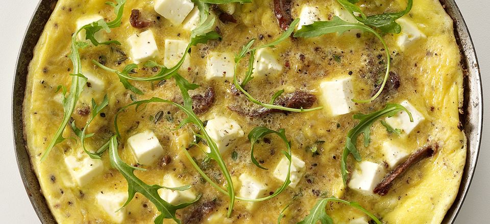 Varm olie op i en lille pande til 2 personer. Sautér skalotteløg og hvidløg, uden at det bruner, i et par minutter. Kom strimler af soltørrede tomater i og sauter ydermere i 1 min. Pisk æg med fløde, timian, salt og kværnet peber. Kom æggeblandingen på panden og lad den stå på svag varme til æggemassen er stivnet. Kom salatost i tern på. Anret æggekagen med rucola drysset på og servér straks med groft rugbrød og frisk tomatsalat.