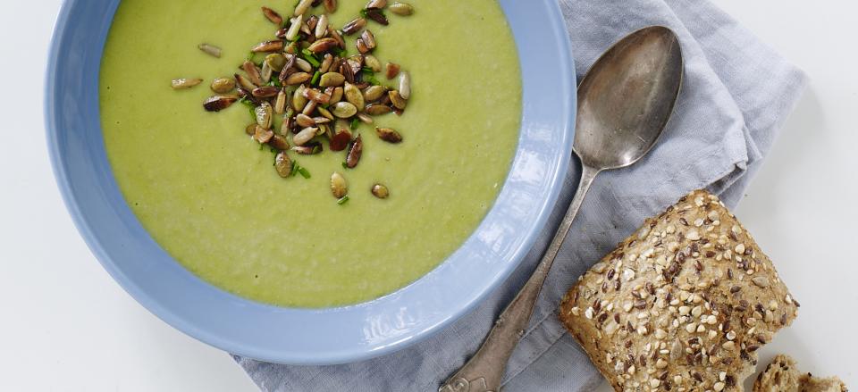 Rist solsikkekerner og græskarkerner i en tør pande og vend med hakket purløg.