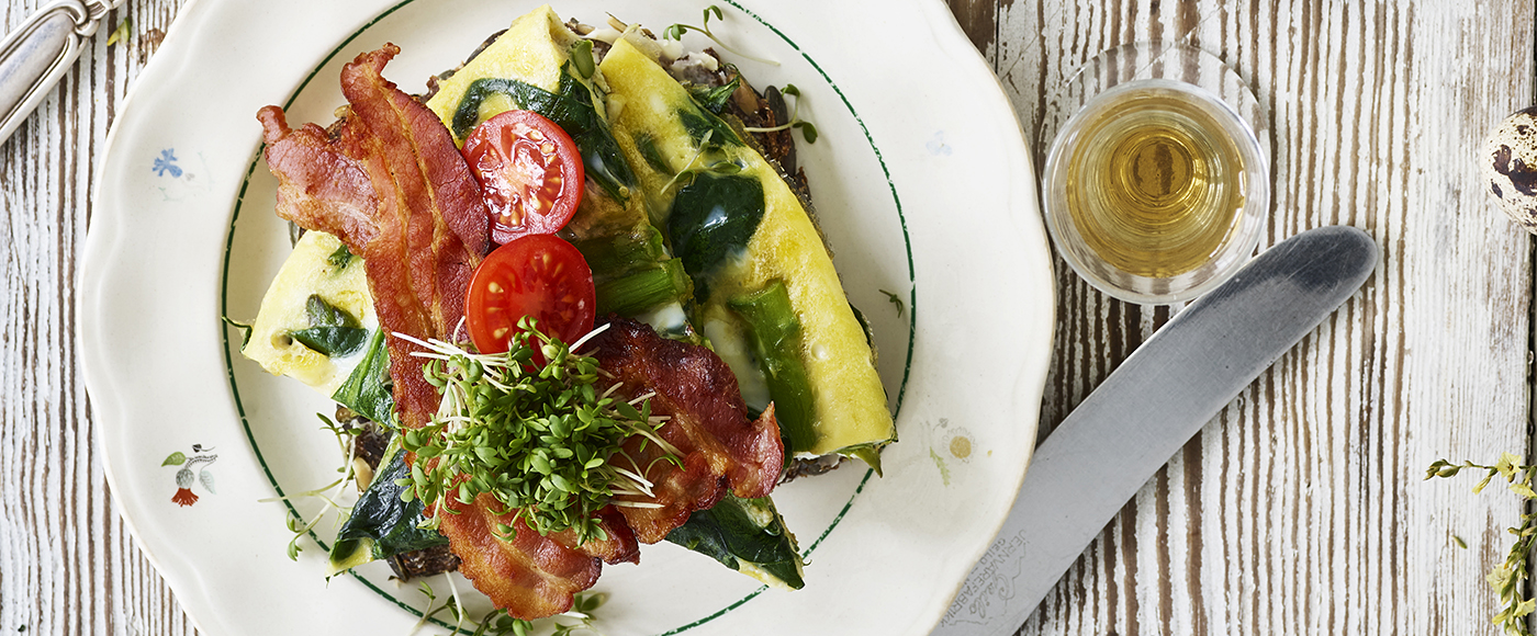 Æggekagemadder med spinat, asparges og Tulip bacon