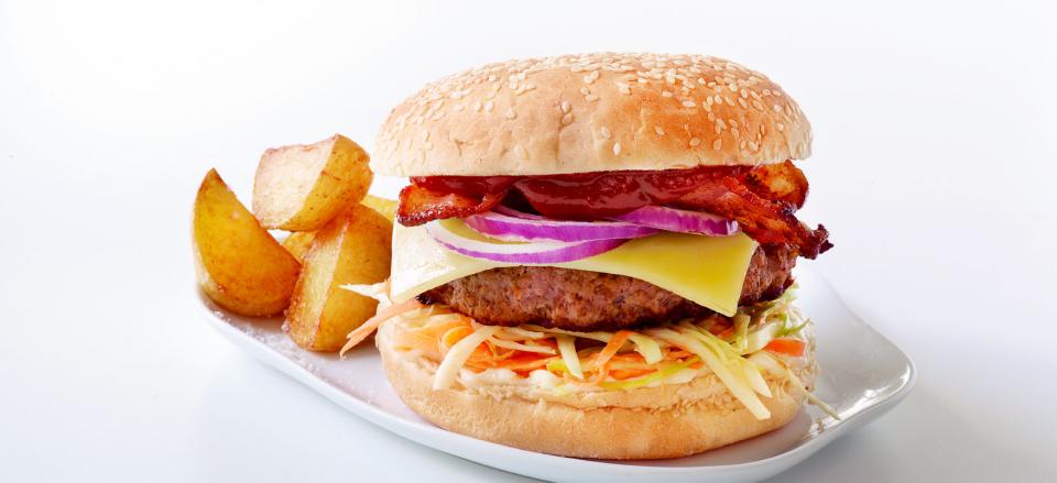 Saml burgeren med coleslaw, bøf, chedderost, rødløg i skiver og ristet bacon.