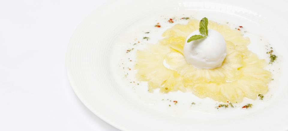 Fordel saucen over og rundt om iskugler og ananas.