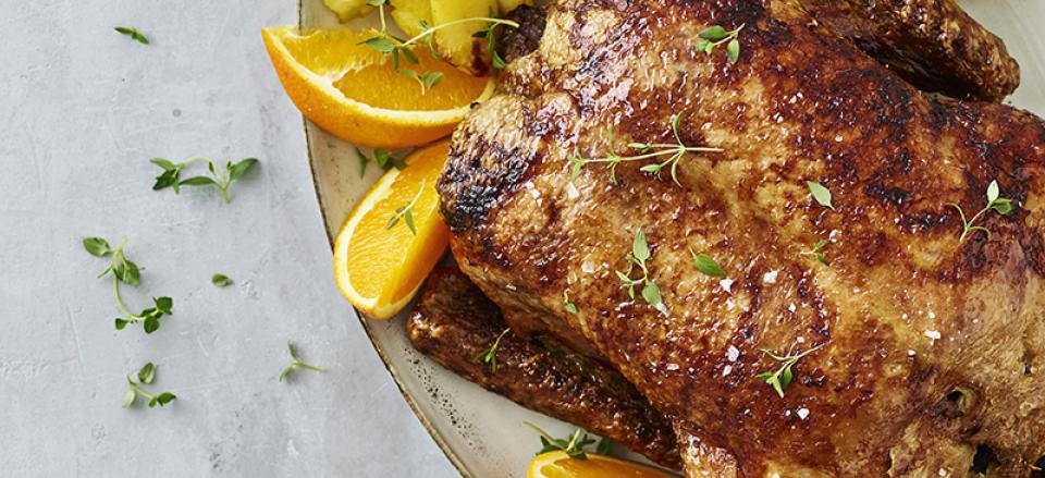 Krydr med salt både ind- og udvendigt, og kom appelsinskallerne ind i den.