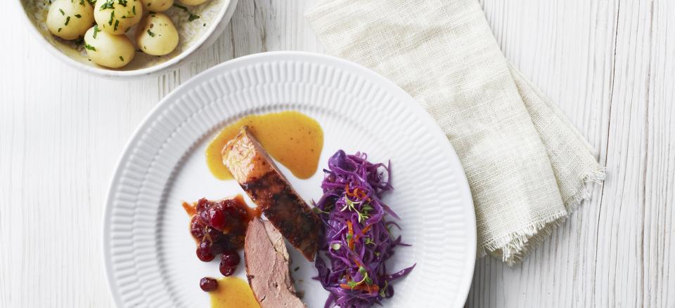 Server rødkålen til anden sammen med tranebærkompot, vaniljesky og kartofler.