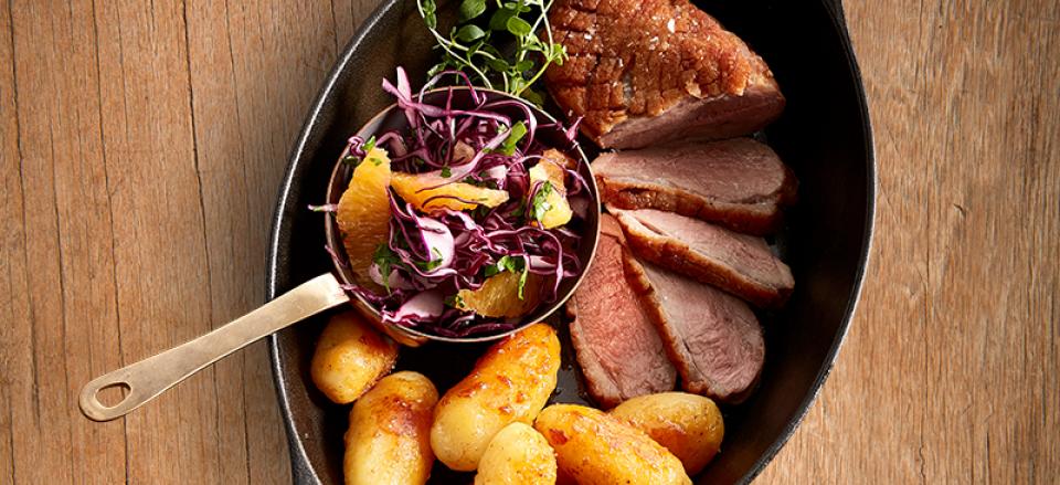Skær kødet i skiver og anret det i gryden sammen med kartofler og den syrlige rødkål.