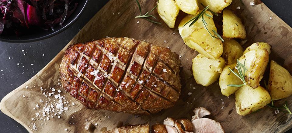 Andebryst med balsamicorødkål og kartofler ristet i andefedt