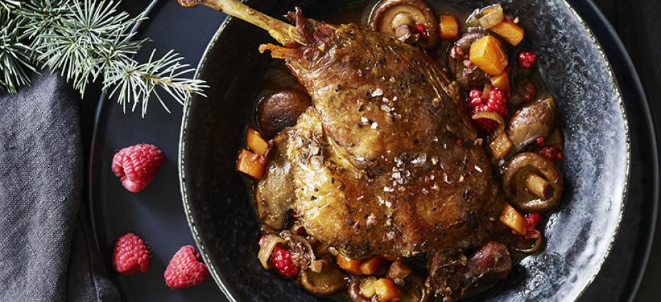 Kom svampe og hindbær i de sidste 10 min og lad evt. låget være af, så saucen kan koge lidt ind.