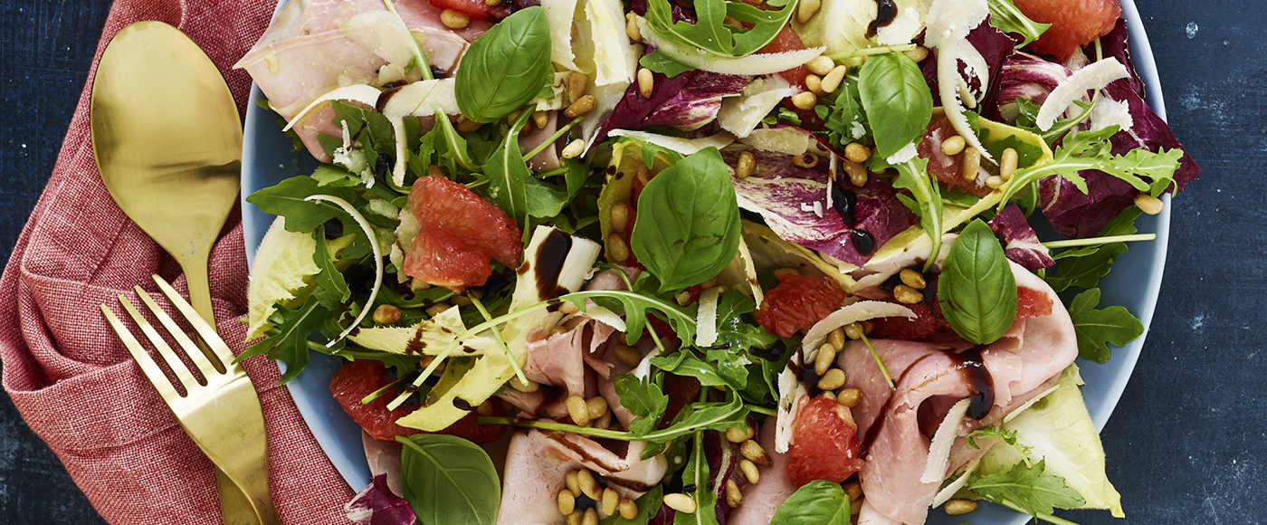 Antipastosalat med skinke, grapefrugt og parmesan