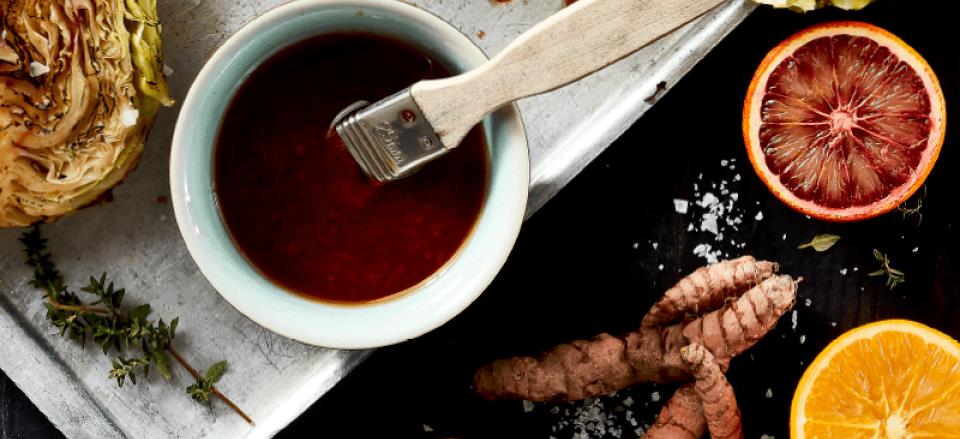 Blend massen sammen med rapsolie, saften fra appelsinen, tomatpuré, soja, sambal oelek, timian, honning og salt.