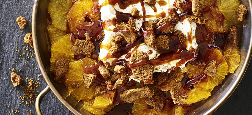 Appelsiner og klementiner med karamelsauce og kanelkiks