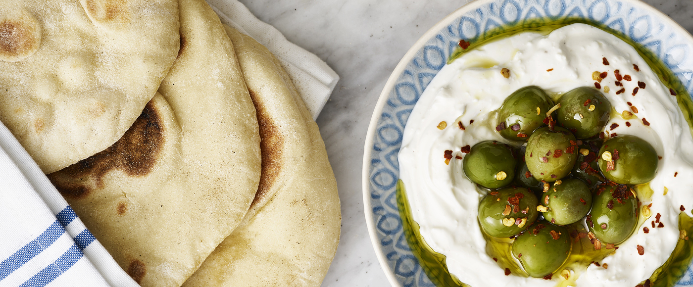 Arabiske fladbrød med yoghurtdip med feta og oliven
