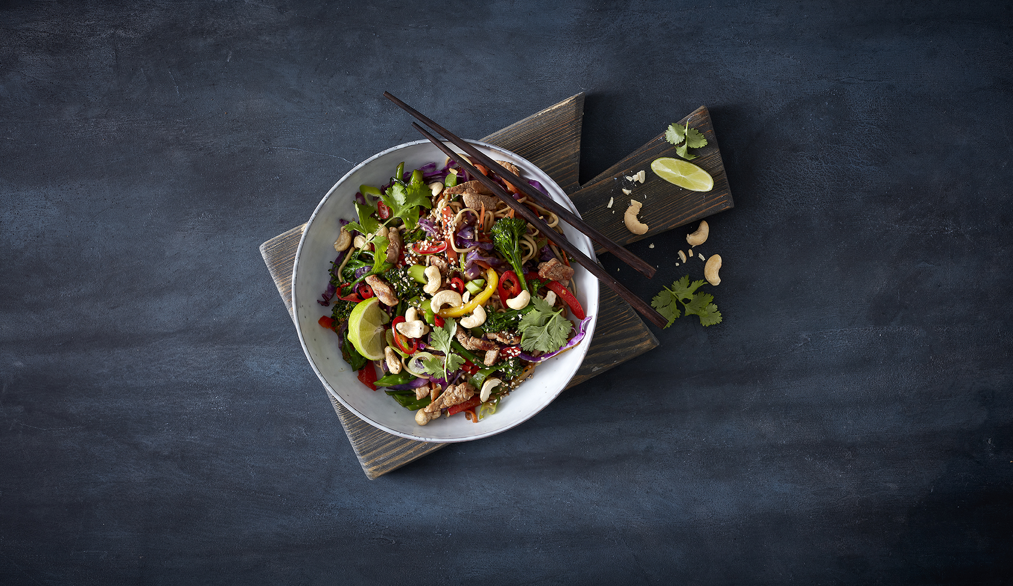 Asiatisk wok med mørbrad af gris, ægnudler, kål, forårsløg og cashewnødder