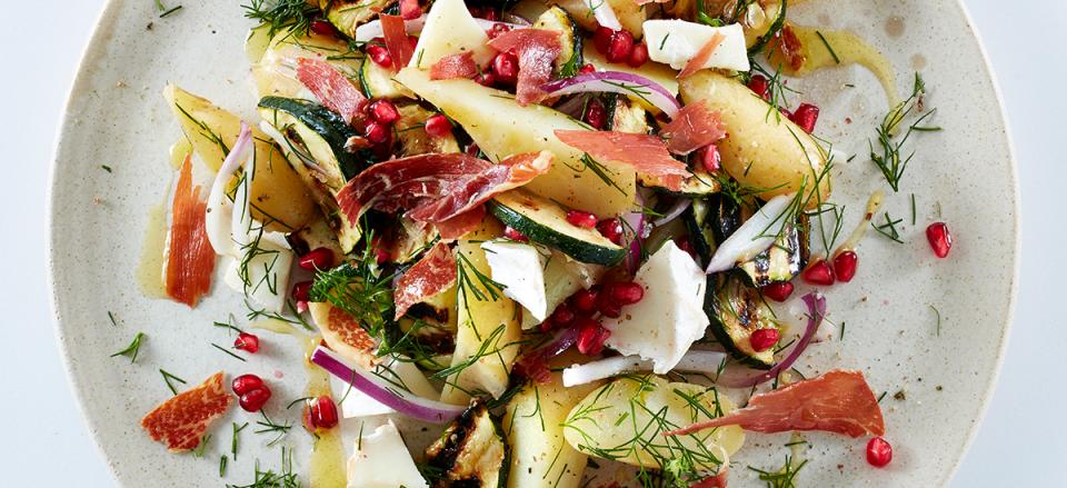 Kartofler, grillet squash, rødløg, granatæblekerner, gedeost, dild og drys med stykker af sprød parmaskinke.