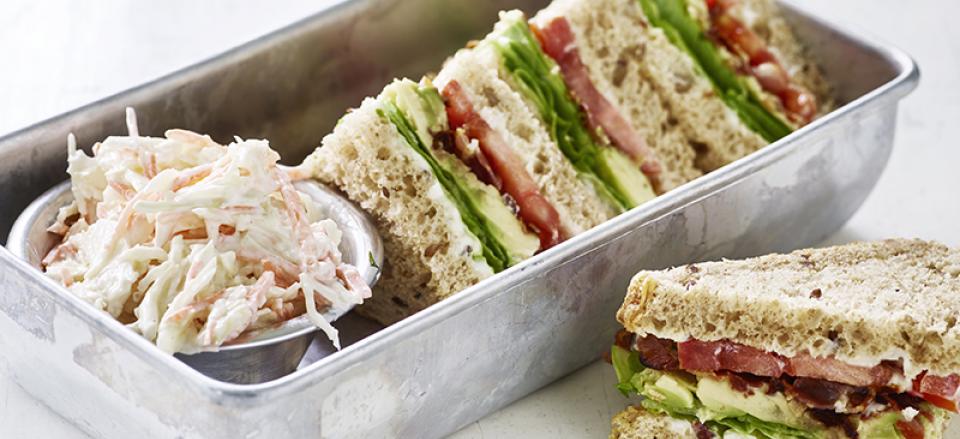 Smør sandwichbrødet med mayonnaise og læg brødene sammen med tomat, salat, bacon og avocado i skiver.