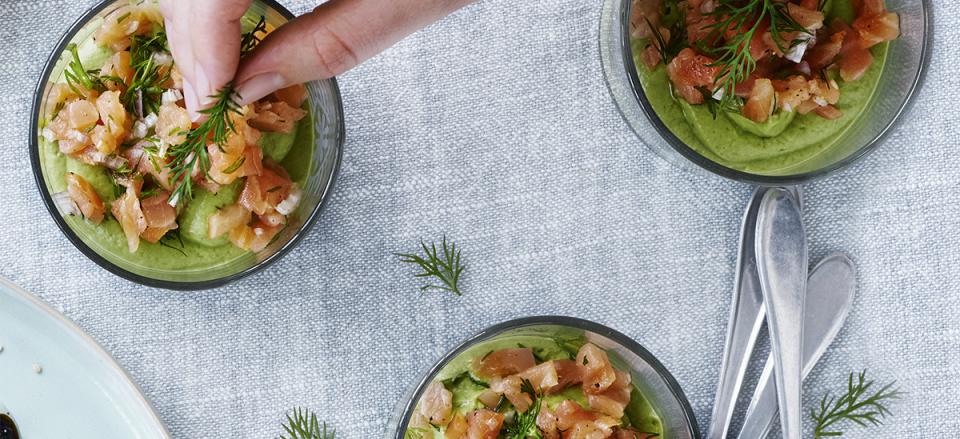 Ved servering pyntes avocadomoussen med laksetatar.
