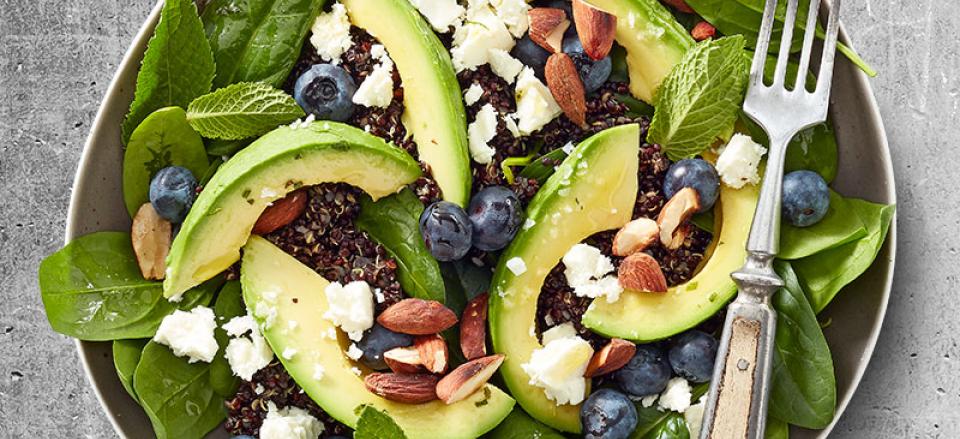 Avocadosalat med blåbær, fetaost, saltristede mandler og mynte-limedressing