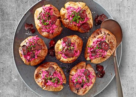 Bagekartofler med rødbedetzatziki, sprøde rødbedechips og purløg