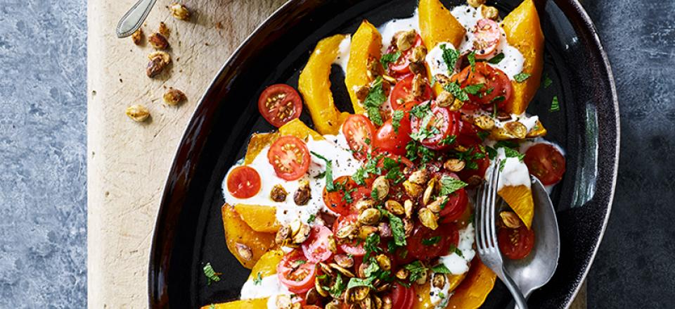 Bagt hokkaido med yoghurt, tomater og ristede græskarkerner