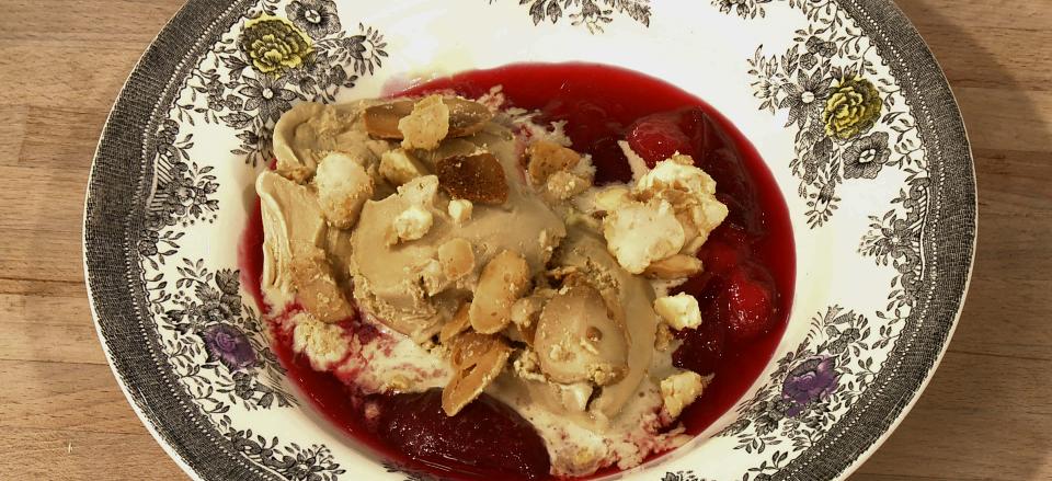 Serveringsforslag: Spis isen med den sprøde bagte chokolade og den syrlige kompot, enten lun eller kold.