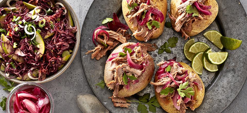 Bagt kartoffel med pulled pork, syltede løg og asiatisk salat