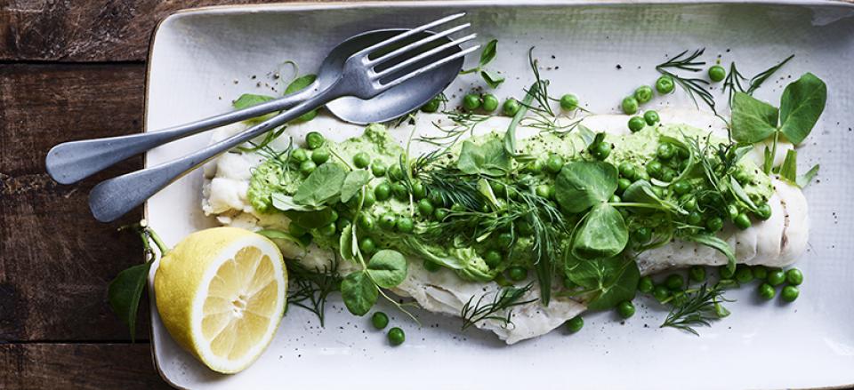 Bagt kulmulefilet med ærtepuré, ærter og urter