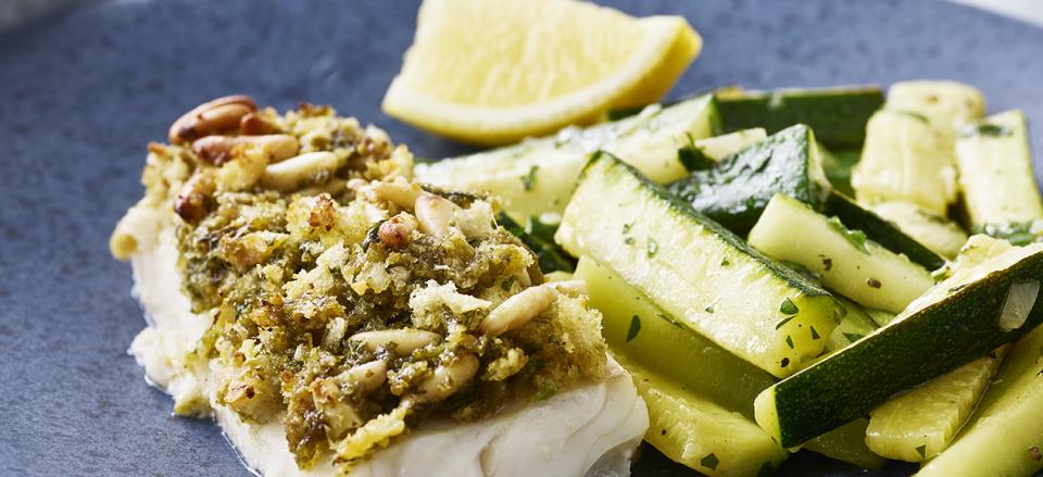 Bagt lyssej med pesto og sprød pinjekernetopping og sauterede squash