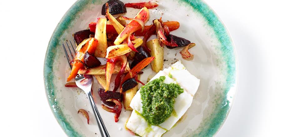 Bagte rodfrugter: Skær rodfrugterne i mindre stykker, og læg dem i et ovnfast fad.
