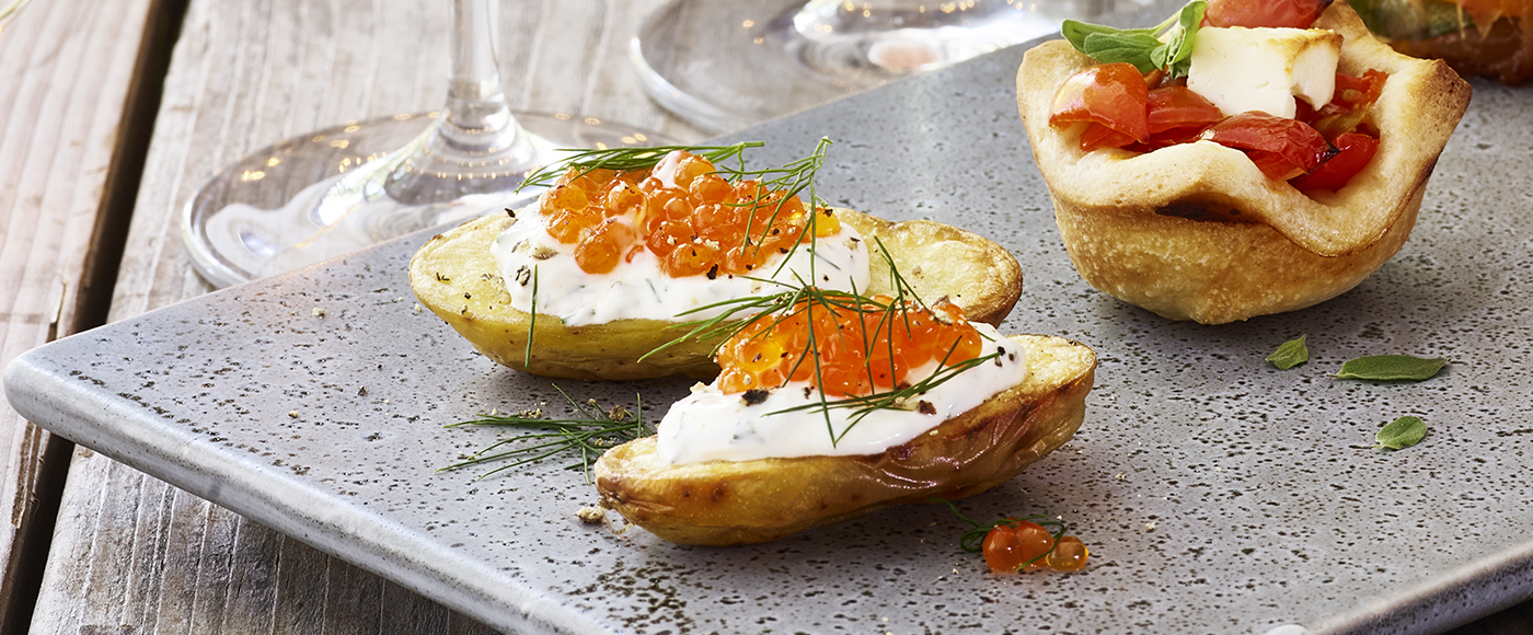 Lad kartoflerne køle lidt af, og top hver med lidt dildcreme og en teskefuld rogn.