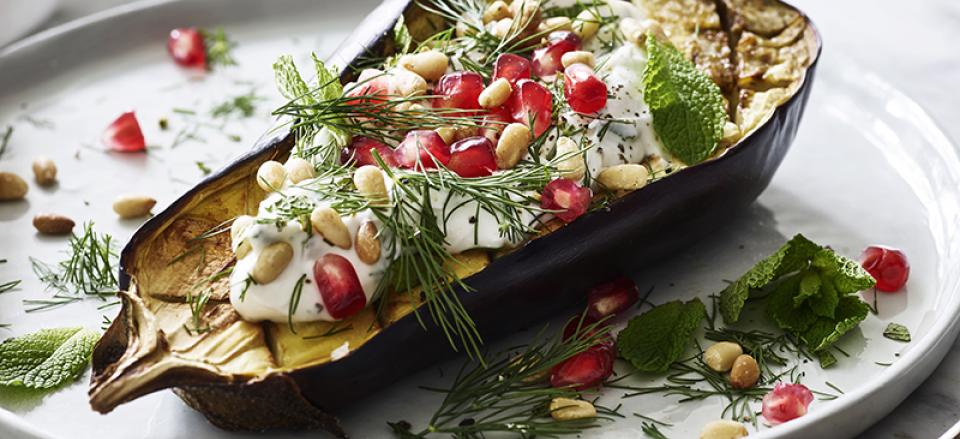 Bagte auberginer med mynte, pinjekerner og granatæble