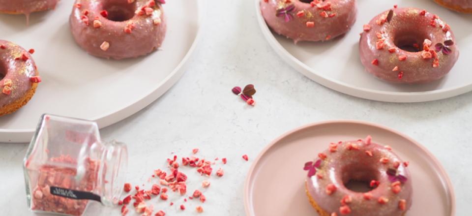 Dyb de afkølede donuts i jordbærglasuren, så halvdelen af donuts er dækket med jordbærglasur.