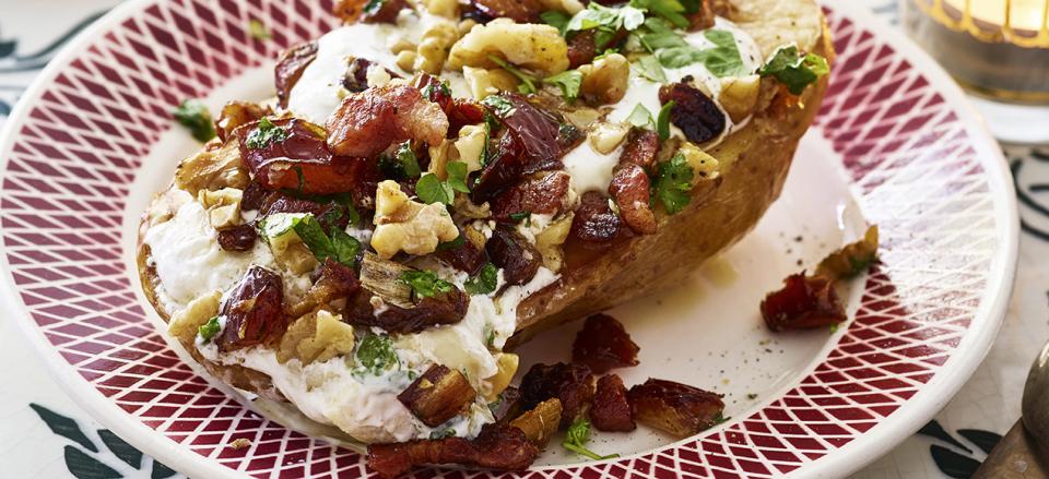 Bagte halve kartofler med gorgonzola og dadel-bacon-topping