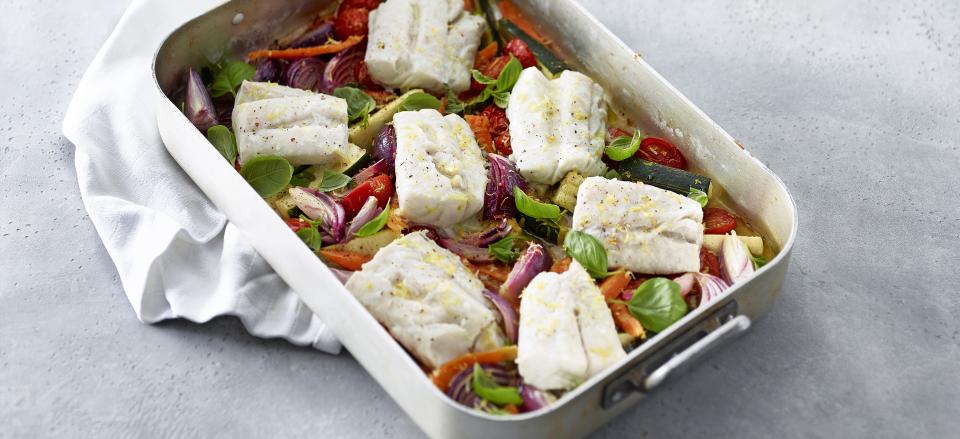 Kom stykkerne ovenpå grøntsagerne og bag dem yderligere ca. 12-15 minutter til fisken er tilberedt.