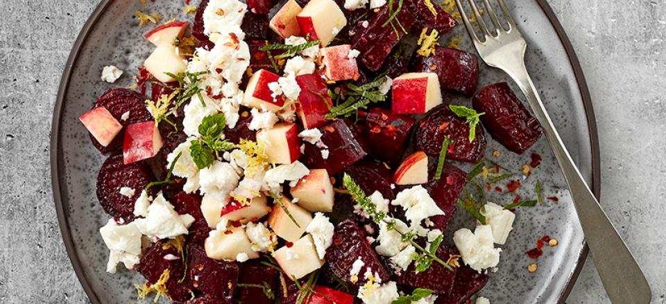 Anret de bagte rødbeder i en flot salatskål, top med feta i brud, æbler skåret i tern, revet citronskal og hakket mynte.