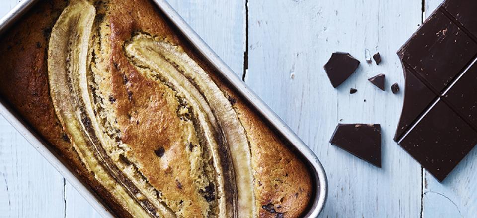 Mos de modne bananer og vend i dejen sammen med grofthakket chokolade.