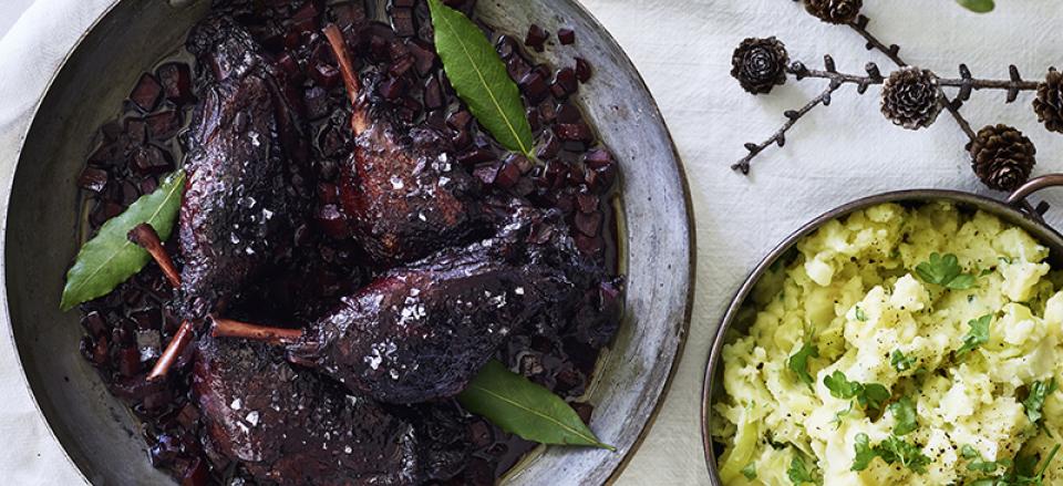 Berberiandelår med kirsebærglace og kartoffel-porremos