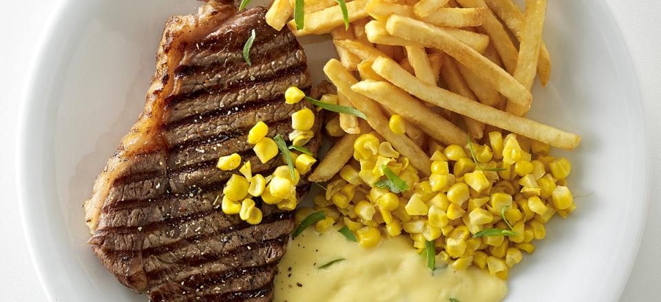 Servér saftige Entrecotes med hjemmelavet sauce Bearnaise, pommes frites og stegte majs.
