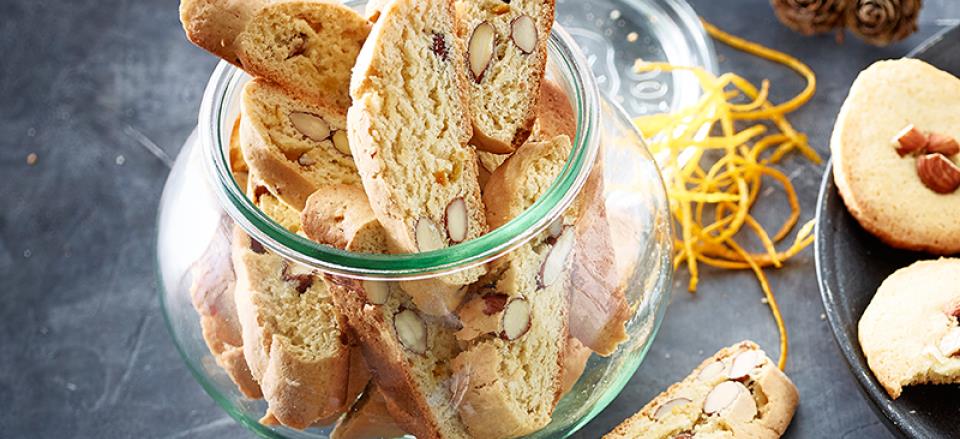 Bland herefter mandler, appelsinsaft, appelsinskal og syltet ingefær i.