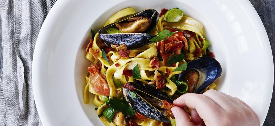 Blåmuslinger med bacon, fløde, tomater og pasta