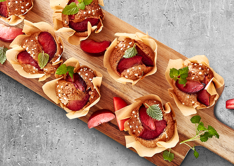 Servér blommemuffins på et bræt, og pynt af med lidt frisk citronmelisse.