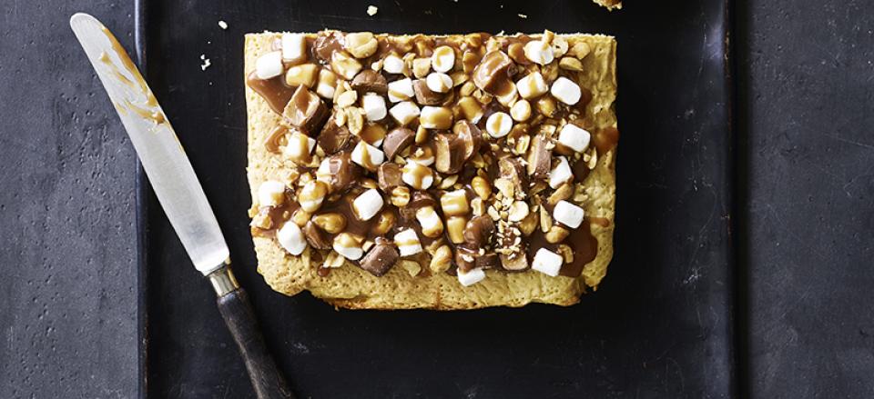 Lad den køle lidt af, så den tykner og pynt kagen med den inden den skæres i firkantede stykker.