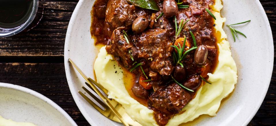 Skær oksekødet i store tern, og kom det i en beholder sammen med rødvin, 1 løg i tynde både, 1 kvist rosmarin, 2 laurbærblade, 3 kviste timian, revet appelsinskal, peberkorn og 2 fed hvidløg i skiver.