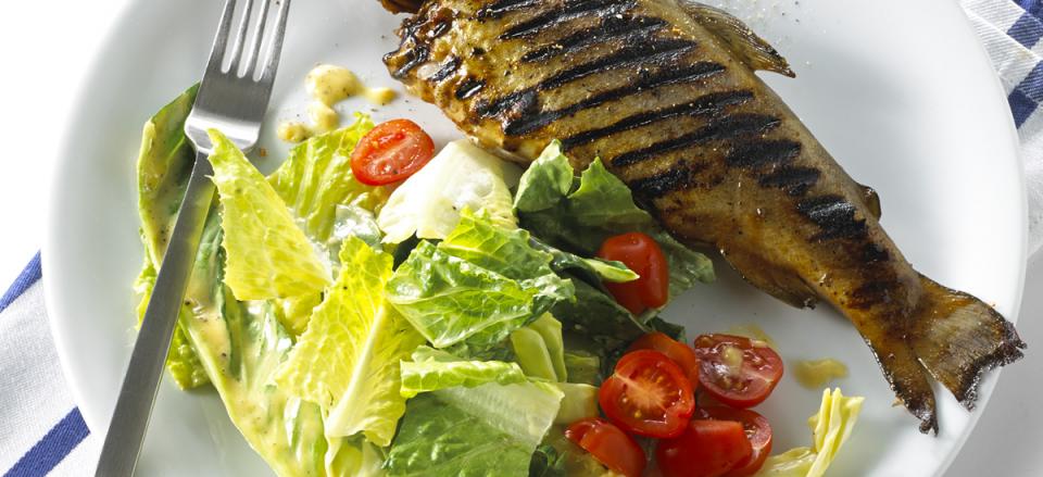 Vend forsigtigt dressingen med salaten og servér med fisk og halve tomater.