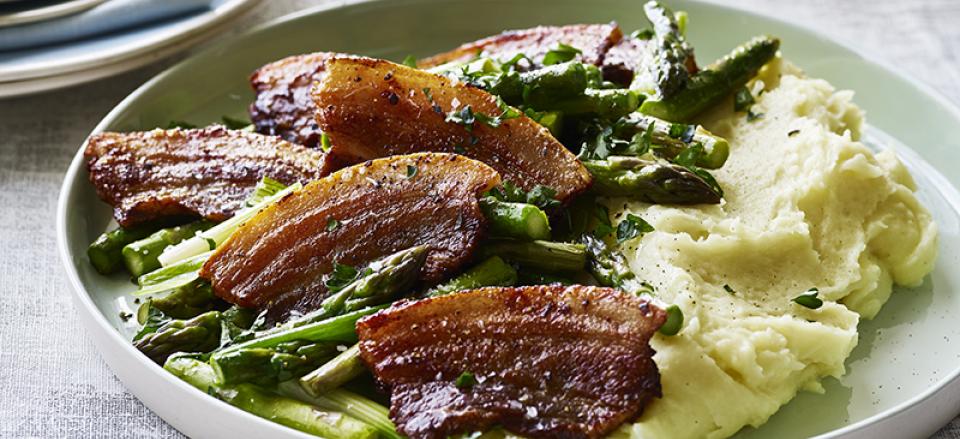 Server kartoffelmosen toppet med asparges og forårsløg, stegt flæsk og et drys hakket persille.