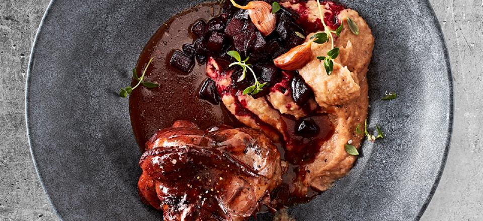 Braiseret lammeskank med rodfrugtpuré og balsamicorødbeder