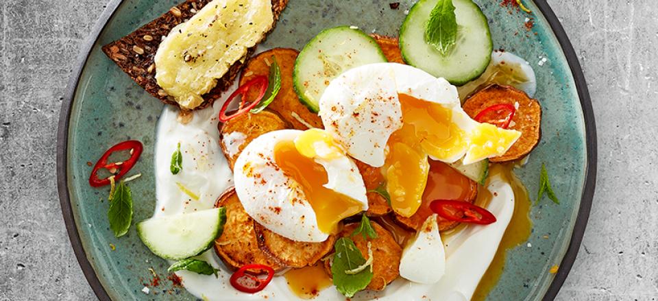 Anret en tallerken med en bund af græsk yoghurt, top med sprøde søde kartoffelskiver, pocheret æg, agurk i skiver, frisk chili i tynde skiver og pynt med mynte, lidt citronsaft og tandoori-krydderi.