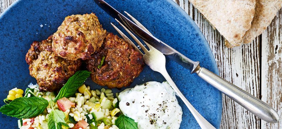 Bulgursalat med lammesquashdeller og tzatziki