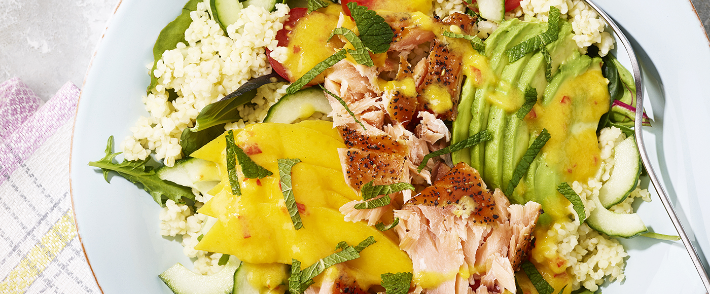 Bulgursalat med varmrøget laks og mango-appelsindressing