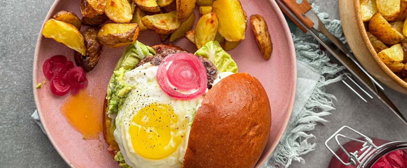 Saml bollerne med salat, bøf, tomat, spejlæg, syltede rødløg og avocadocreme og server dem med de brasede kartofler ved siden af.